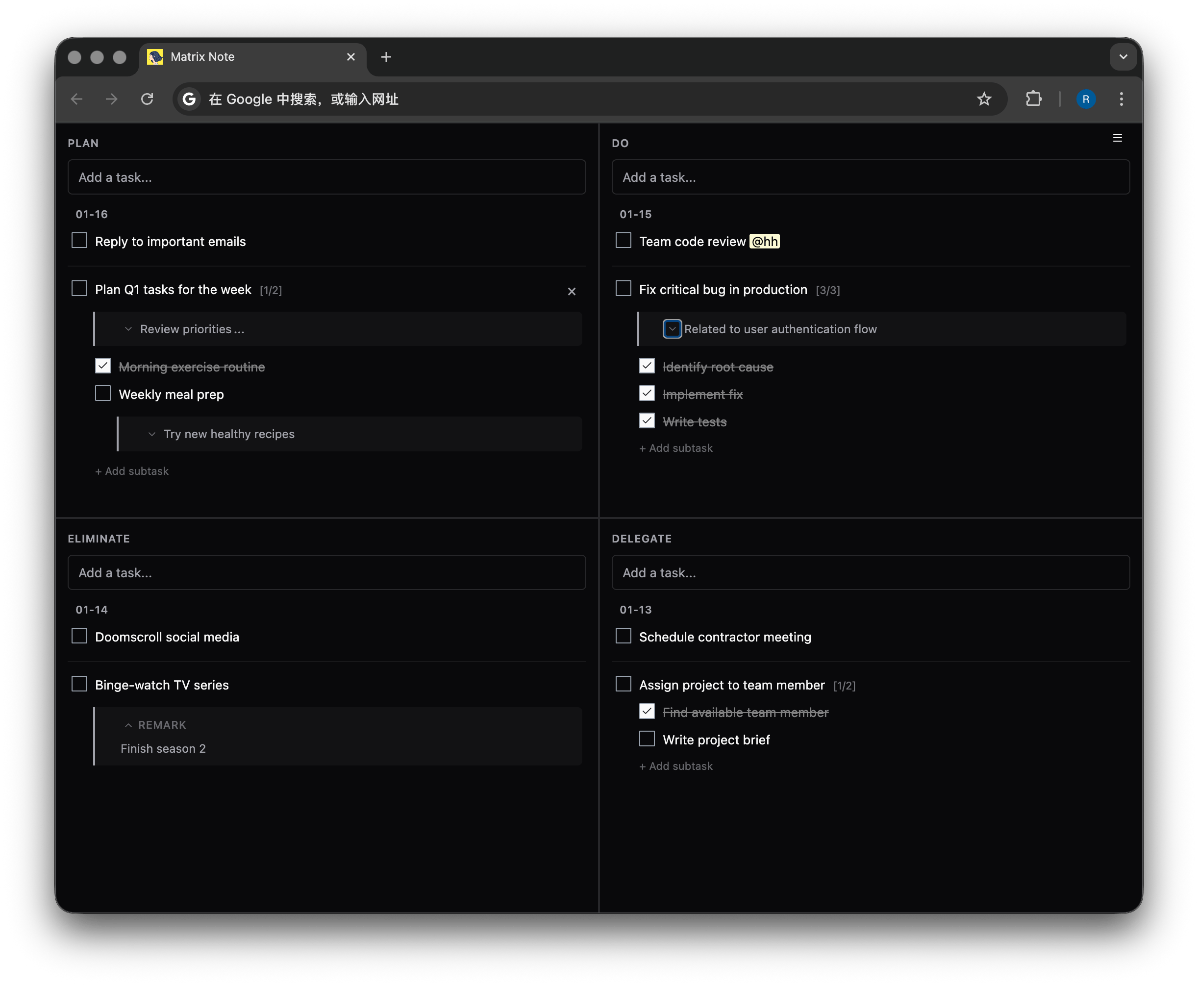 humpy 9 小时 25 分钟前 我自己用 ai 写了一个 chrome newtab 插件,基于紧急+重要四象限,每次用浏览器就能看见: