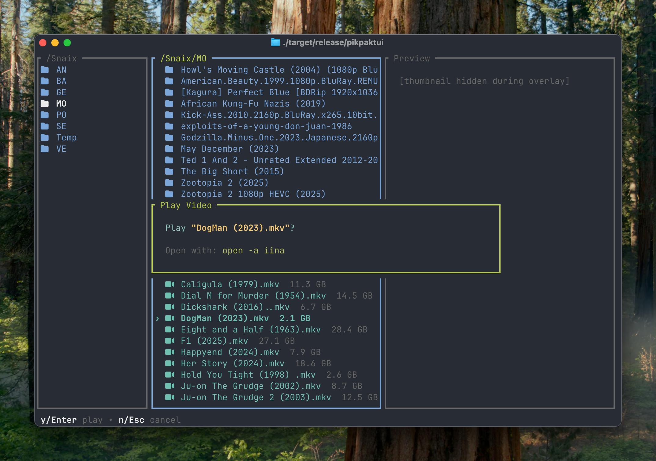 TUI 模式:三栏 Miller 布局(类似 Yazi ),支持缩略图预览、视频串流播放( IINA/mpv/VLC )、离线下载管理,全键盘操作。