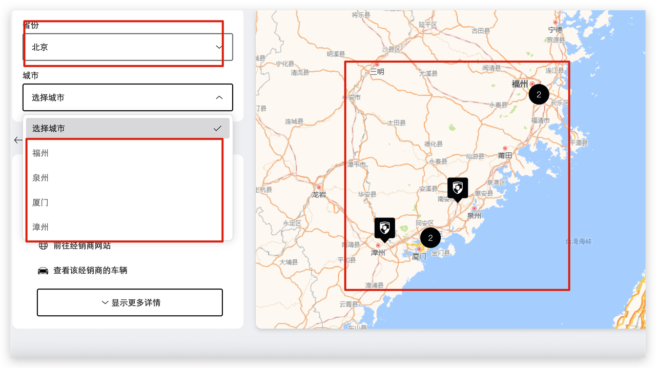 感觉同样的组件,首页左上角的寻找经销商里就是对的,点击进在地图上寻找经销商这一页: https://www.porsche.cn/cn/zh-CN/dealersearch/ 就错了。可能是没有复用,拷贝粘贴了两份代码,导致改了一个地方,另一个地方就没动?