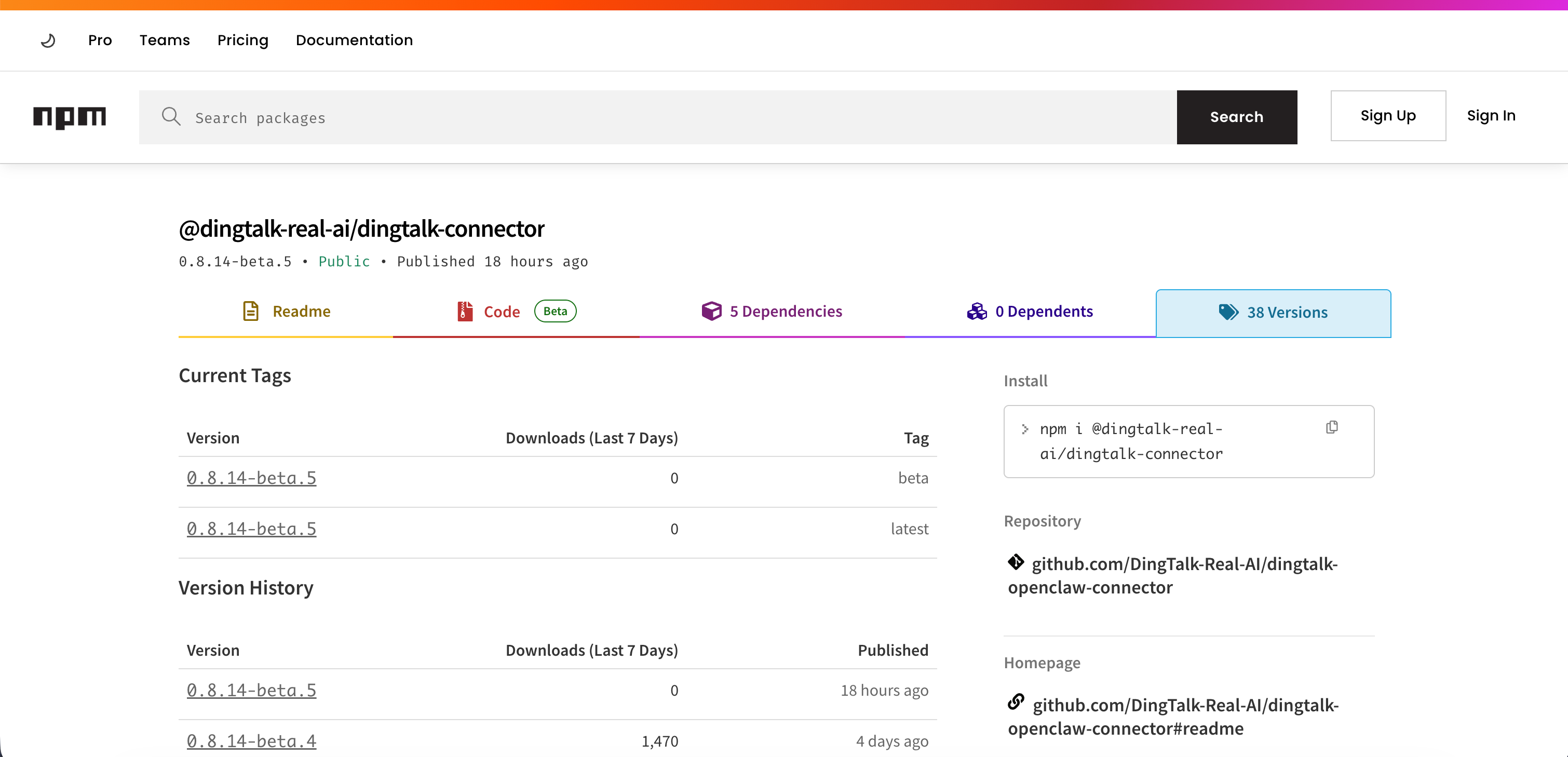 Resolved @dingtalk-real-ai/dingtalk-connector to prerelease version 0.8.14-beta.5, but prereleases are only installed when explicitly requested. Use "@dingtalk-real-ai/dingtalk-connector@beta" (or another prerelease tag) or an exact prerelease version to opt in explicitly.